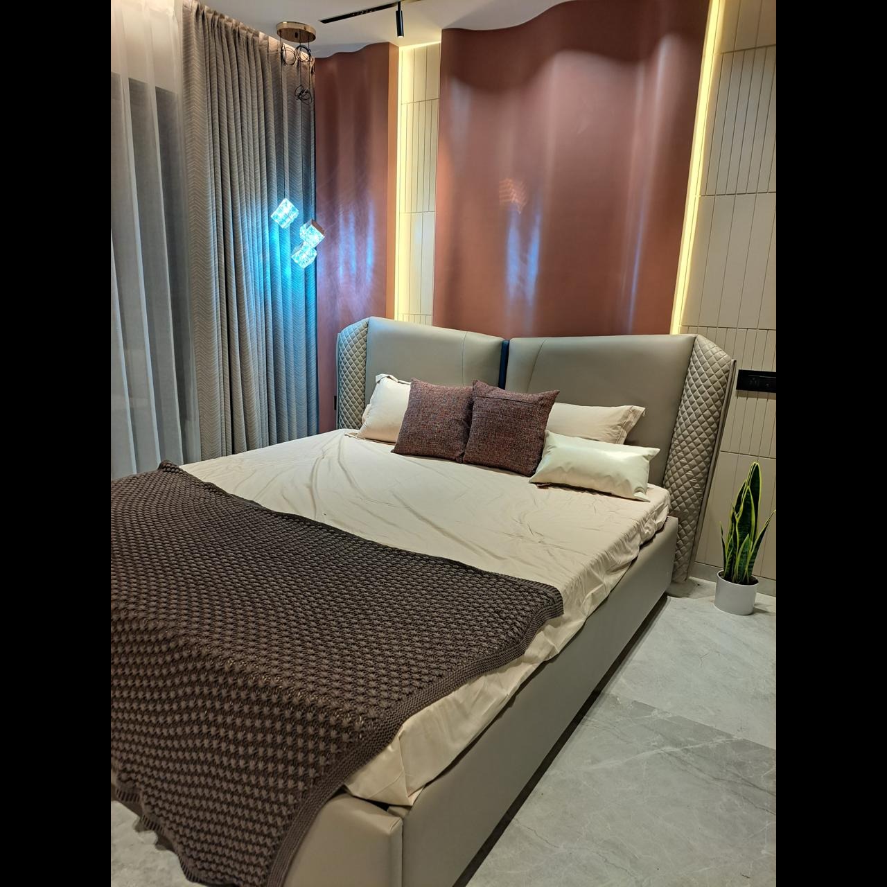 This modern bedroom design blends sophistication with comfort. The centerpiece is a neatly styled bed featuring light beige sheets, crisp white pillows, and rich brown accent cushions, complemented by a dark knitted throw. A quilted gray headboard with illuminated wavy wall panels creates a striking backdrop, enhanced by warm ambient lighting. Sleek cube-shaped pendant lights with a subtle blue glow add a modern touch, while floor-length curtains in layered gray and sheer white bring softness to the space. A potted snake plant introduces natural freshness, and the light gray marble flooring completes the elegant, cozy atmosphere.