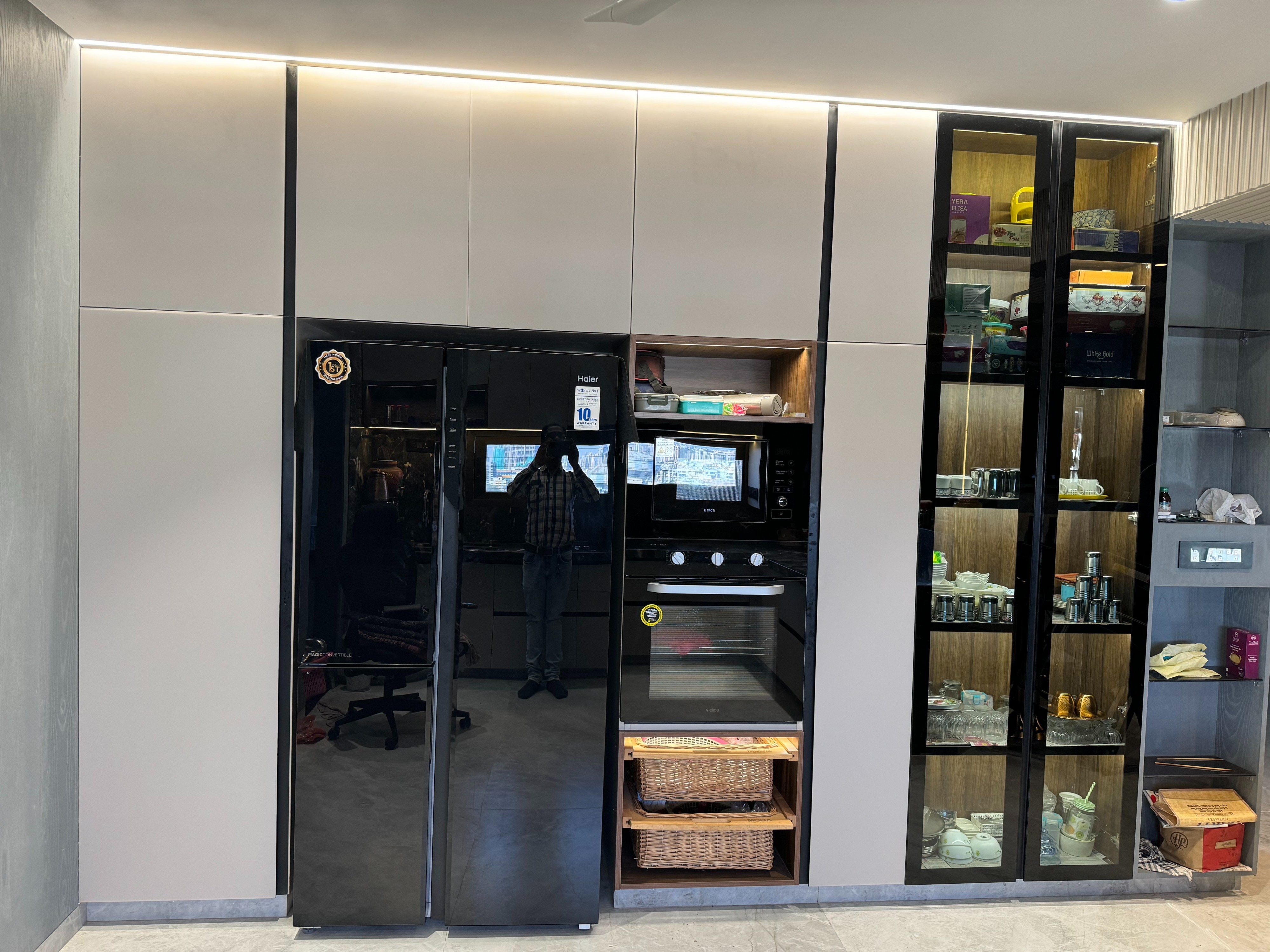 A crockery unit is an essential part of modern home interiors, designed to store and display your dinnerware, glassware, and kitchen essentials in a stylish way. Whether placed in the dining area or kitchen, a well-designed crockery cabinet adds both functionality and elegance to your space. A modern crockery unit not only provides storage but also acts as a design statement. With customizable options, you can match it perfectly with your interior theme and lifestyle needs. Fridge Section Design: Smart & Functional Kitchen Planning The fridge section in a modular kitchen is a dedicated space designed to properly accommodate your refrigerator while maintaining a seamless kitchen layout. A well-planned fridge unit enhances accessibility, ventilation, and overall kitchen aesthetics.